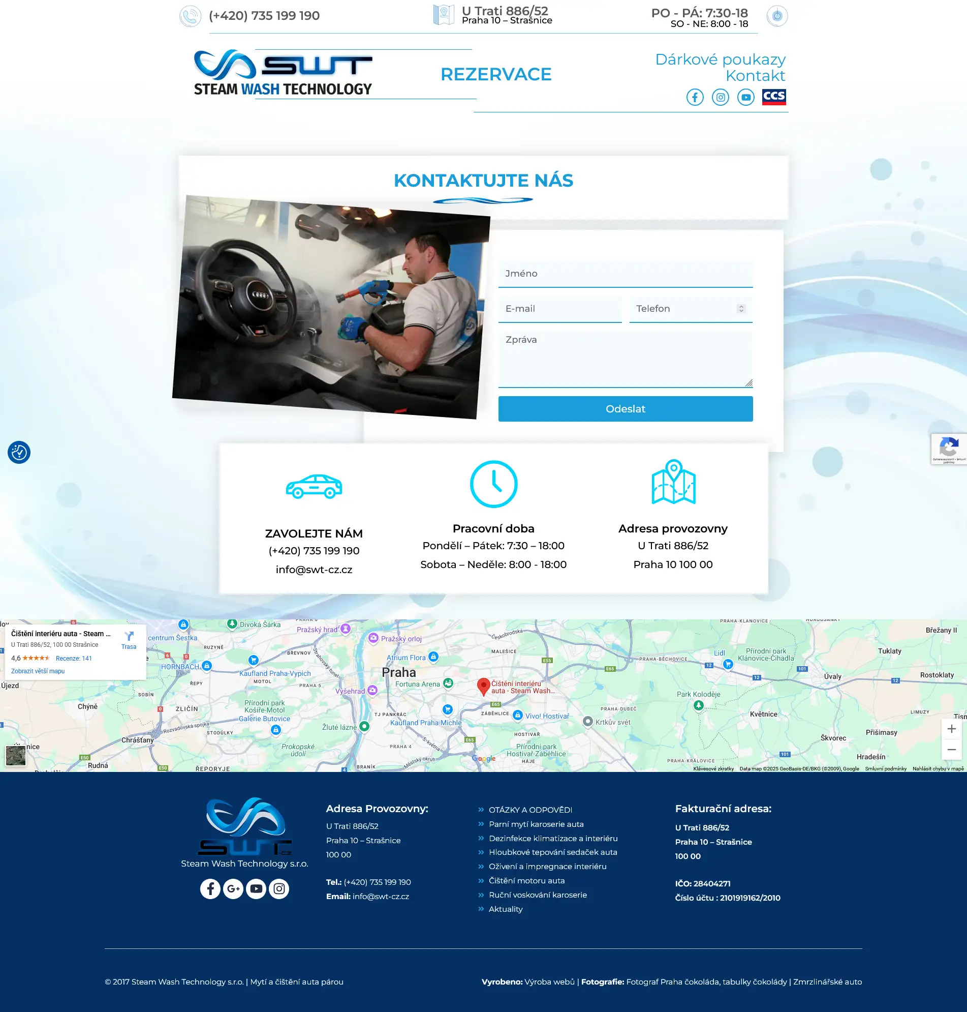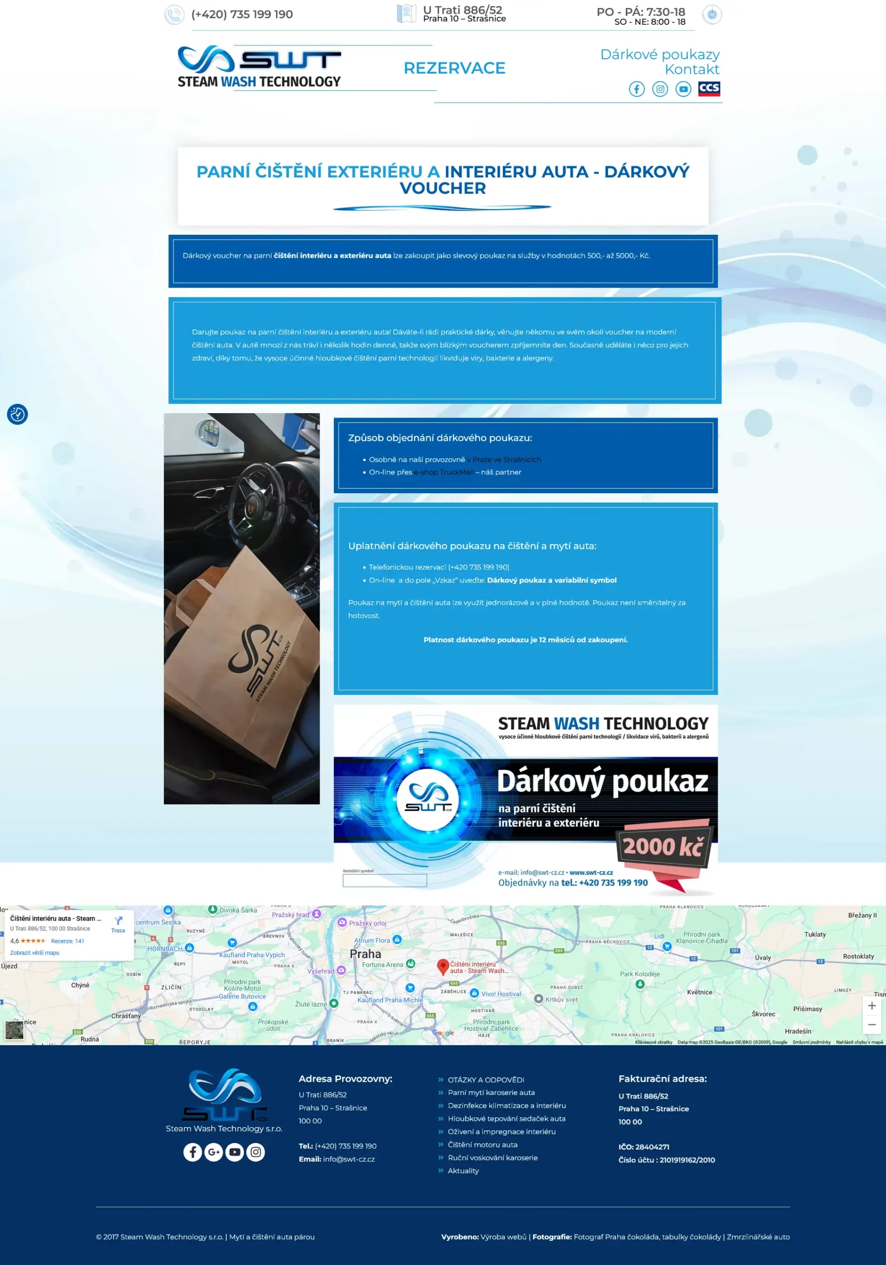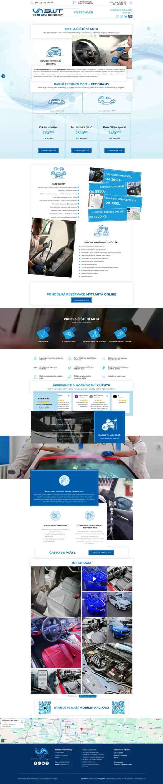Součástí řešení je také možnost online rezervace, díky které si klient může jednoduše vybrat termín a konkrétní typ služby. Web obsahuje detailní popisy programů čištění, fotografie výsledků a jasné rozdělení služeb pro lepší orientaci.